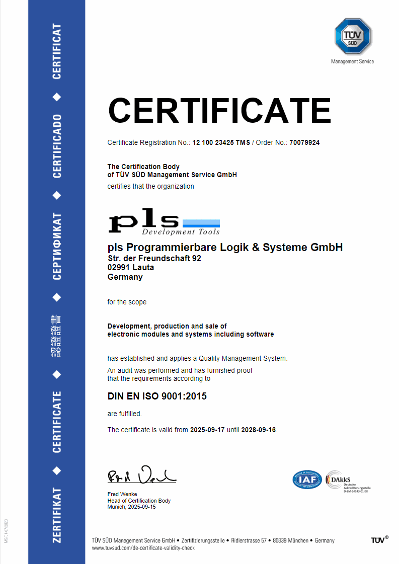 PLS has established and applies a Quality Management System for Development, production and sale of electronic modules and systems including software.