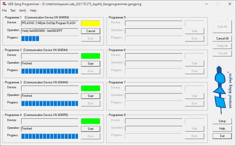 UDE® Gang Programmer can program FLASH memory devices simultaneously to save time and optimize the resource usage in a production environment.