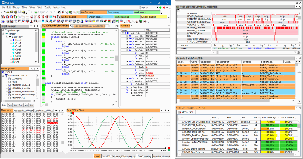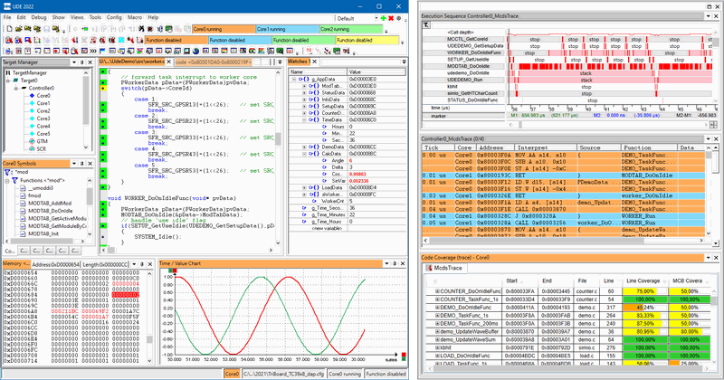UDE® offers advanced functions for non-intrusive debugging, testing and run-time analysis based on recorded trace information provided by on-chip trace systems of various microcontrollers and embedded processors.